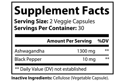 Ingredients: Ashwagandha, Black Pepper. Inactive Ingredients: Cellulose (Vegetable Capsule).