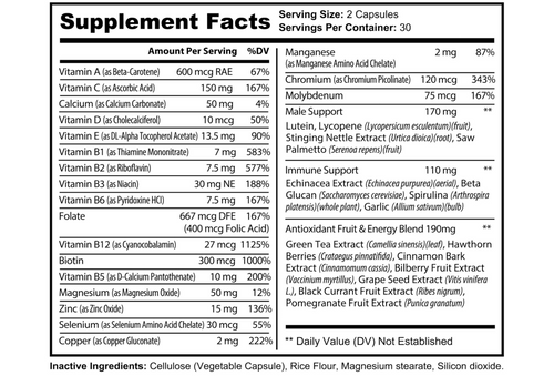 Ingredients: Vitamin A (as Beta-Carotene), Vitamin C (as Ascorbic Acid), Calcium (as Calcium Carbonate), Vitamin D (as Cholecalciferol), Vitamin E (as DL-Alpha Tocopherol Acetate), Vitamin B1 (as Thiamine Mononitrate), Vitamin B2 (as Riboavin), Vitamin B3 (as Niacin), Vitamin B6 (as Pyridoxine HCI), Folate, (400 mcg Folic Acid), Vitamin B12 (as Cyanocobalamin), Biotin, Vitamin B5 (as D-Calcium Pantothenate), Magnesium (as Magnesium Oxide), Zinc (as Zinc Oxide), Selenium (as Selenium Amino Acid Chelate), Copper (as Copper Gluconate), Manganese (as Manganese Amino Acid Chelate), Chromium (as Chromium Picolinate), Molybdenum, Lutein, Lycopene (Lycopersicum esculentum)(fruit), Stinging Nettle Extract (Urtica dioica)(root), Saw Palmetto (Serenoa repens)(fruit), Green Tea Extract (Camellia sinensis)(leaf), Hawthorn Berries (Crataegus pinnatida), Cinnamon Bark Extract (Cinnamomum cassia), Bilberry Fruit Extract(Vaccinium myrtillus), Grape Seed Extract (Vitis vinifera L.), Black Currant Fruit Extract (Ribes nigrum), Pomegranate Fruit Extract (Punica granatum), Echinacea Extract (Echinacea purpurea)(aerial), Beta Glucan (Saccharomyces cerevisiae), Spirulina (Arthrospira platensis)(whole plant), Garlic (Allium sativum)(bulb).Inactive Ingredients: Cellulose (Vegetable Capsule), Rice Flour, Magnesium stearate, Silicon dioxide.
